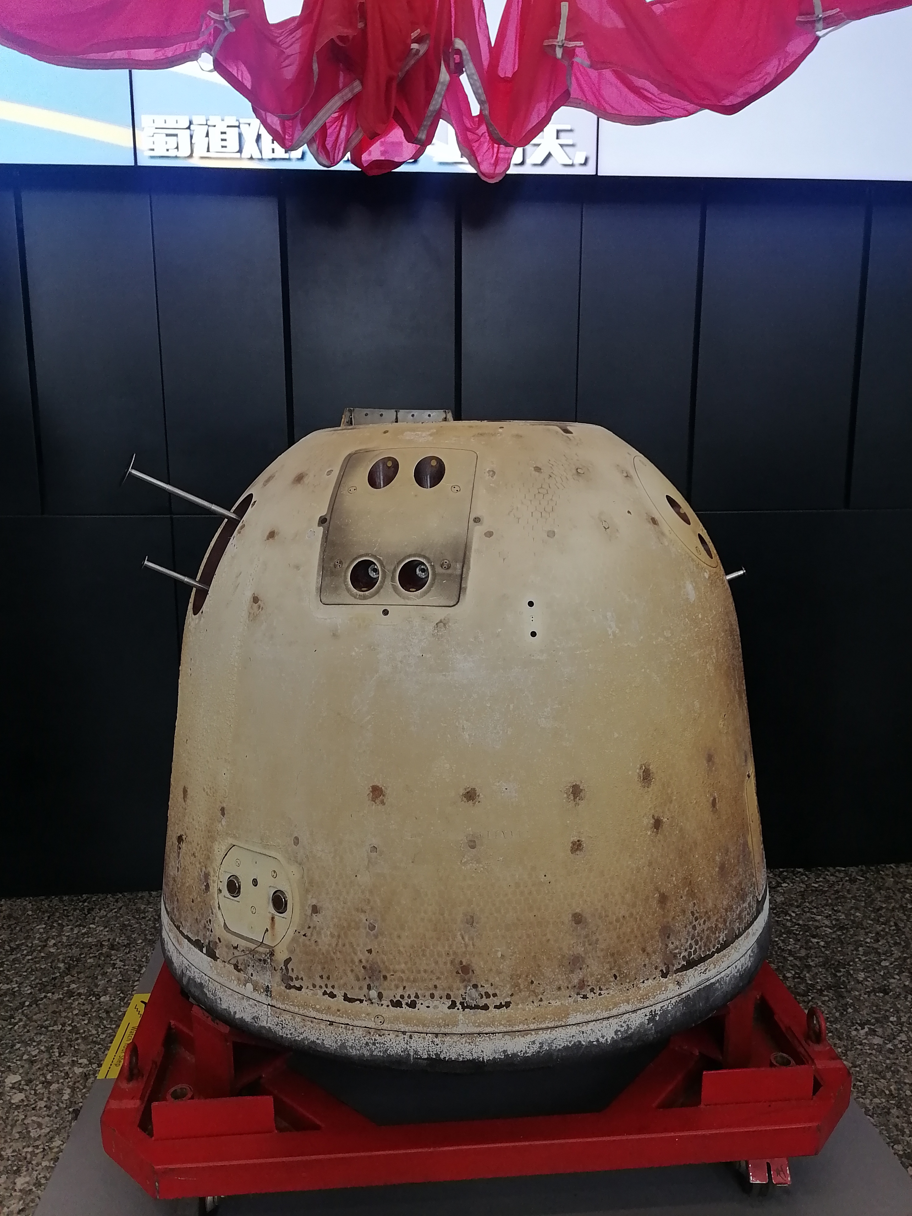 在展厅入口,嫦娥五号返回器实物成为全场焦点。这个重约325千克、大底直径1.26米的“小块头”通体泛黄,采用大钝头球冠倒锥气动构型,继承载人飞船返回舱气动设计,当它以接近第二宇宙速度,半弹道跳跃式再入返回地球,堪称“太空极限操作”。和嫦娥五号返回器一同现身的,还有用高强度锦纶和芳纶材料制成的面积50平方米降落伞。