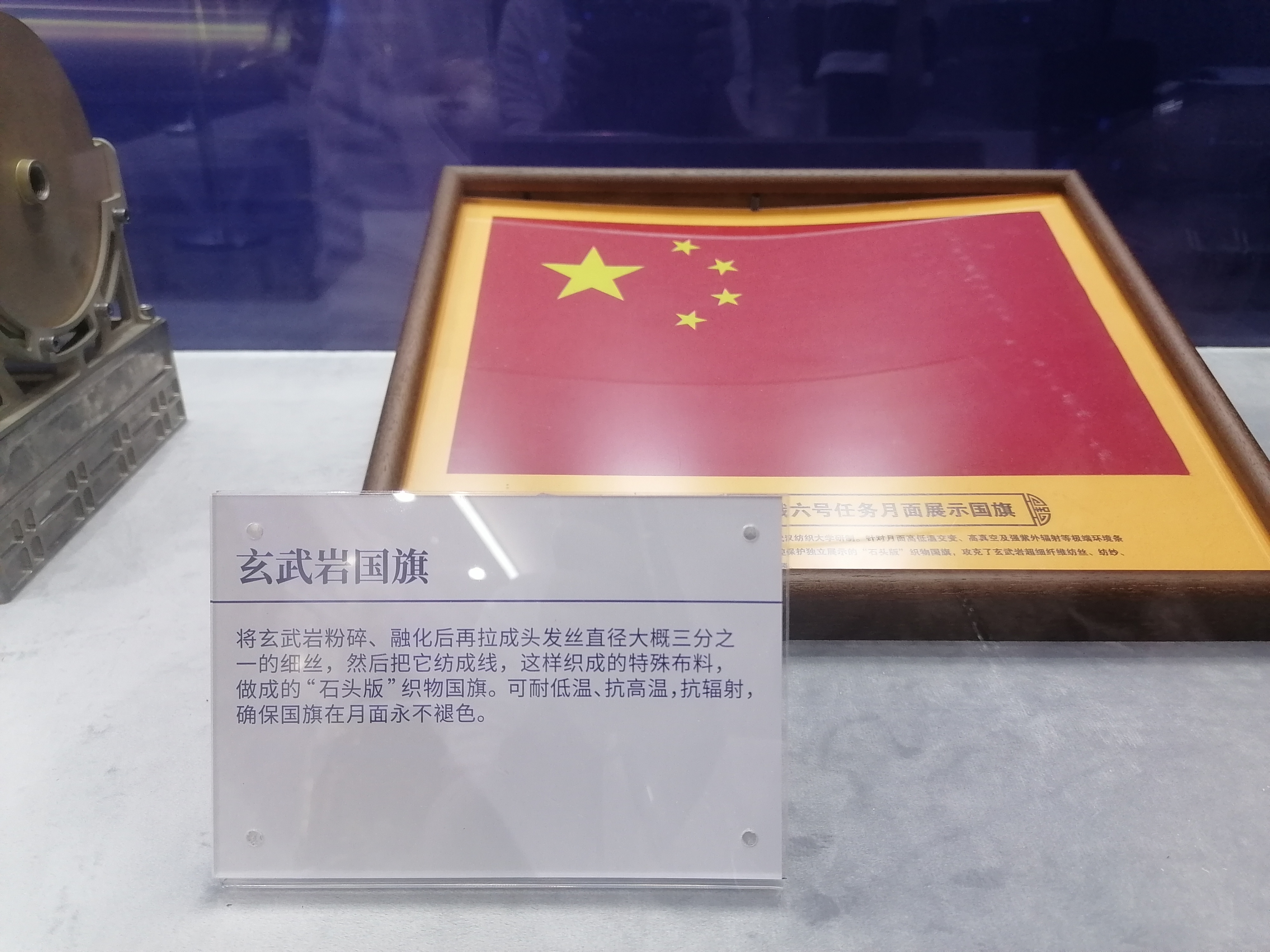 10月1日,国家航天局发布了一张“神仙级”合影:天问二号探测器在深空回眸地球,机械臂上的相机拍下了五星红旗与蓝色星球同框的绝美画面。你可知道,太空中的五星红旗有何不同?这次展出的就有嫦娥六号任务月面展示国旗。这面特殊的国旗由玄武岩制成。将玄武岩粉碎、融化后再拉成头发丝直径大概三分之一的细丝,然后把它纺成线,这样织成的特殊布料,做成的“石头版”织物国旗。可耐低温、抗高温,抗辐射,确保国旗在月面永不褪色。