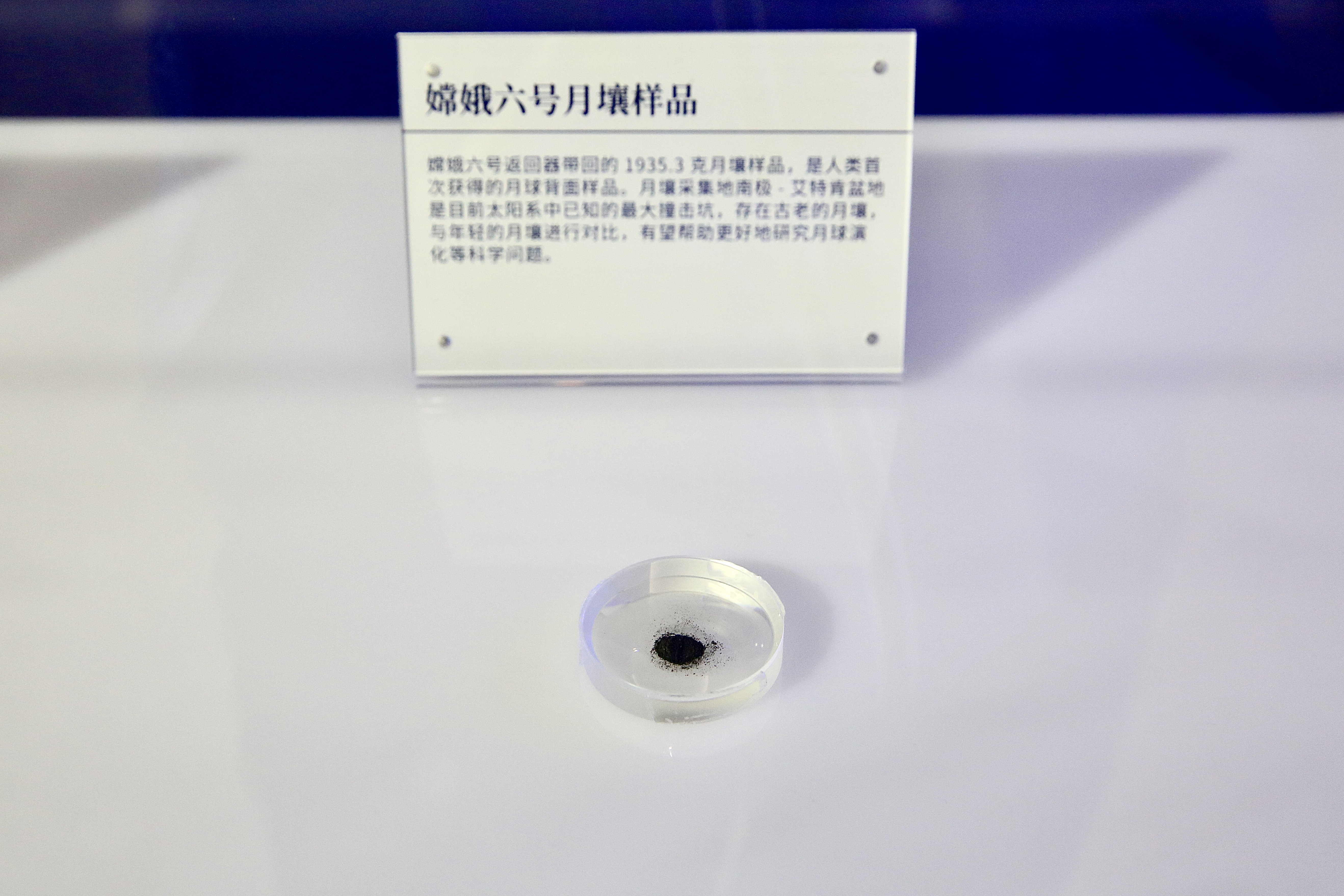 记者在现场看到,嫦娥五号、嫦娥六号分别从月球正面、背面带回的真实月壤,在展柜中静静陈列,细如粉末的月球“土特产”被密封在透明容器中,呈灰黑色。